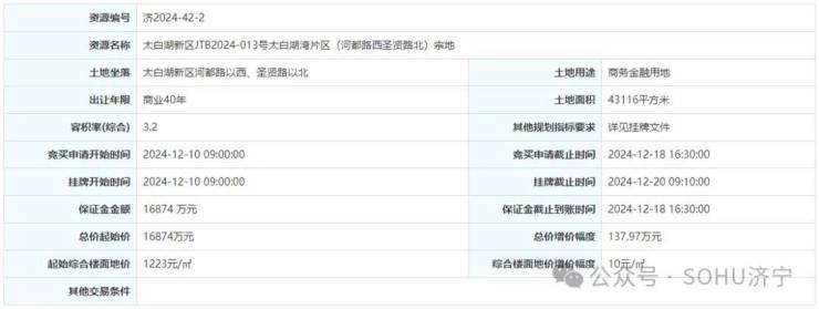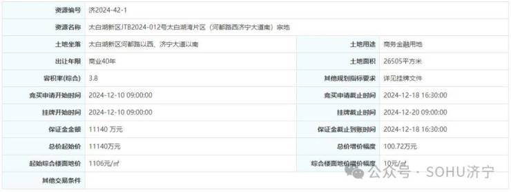 土地位于:太白湖新区河都路以西、济宁大道以南;土地面积:26505㎡(约40亩);土地用途:商务金融用地;出让年限:商业40年;容积率不大于3.8;起始价:11140万元,综合楼面价起价:1106元/㎡;最终成交价为:11140万元(约279万元/亩),综合楼面地价成交价:1106元/㎡;溢价率:0.0%;