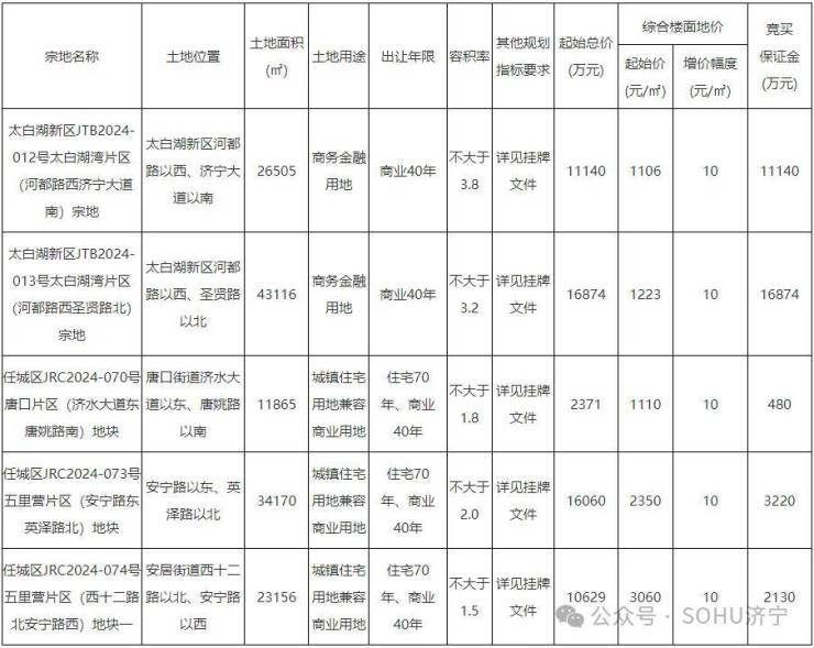 从5宗地块的具体分布上看,任城区3宗、太白湖新区2宗。从土地用途来看,3宗城镇住宅用地兼容商业用地、2宗商务金融用地。土地总面积为138812㎡,约208亩;总起始价为57074万元。