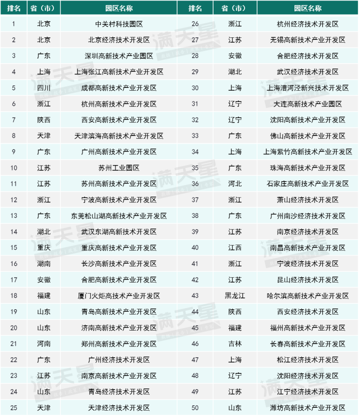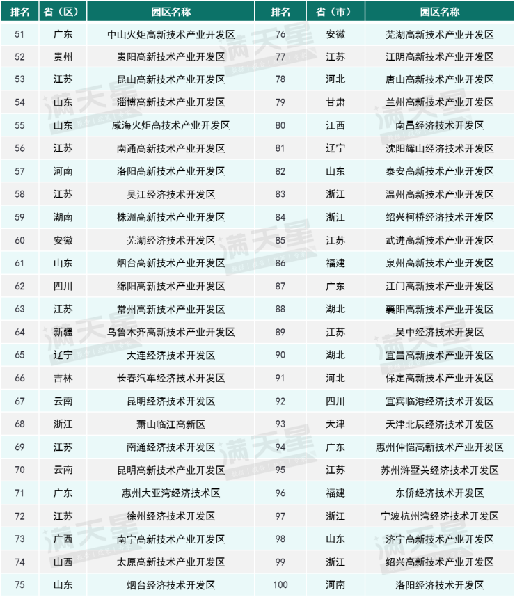 山东共有10家入选,分别是:青岛高新区、济南高新区、青岛经开区、潍坊高新区、淄博高新区、威海火炬高新区、烟台高新区、烟台经开区、泰安高新区、济宁高新区。