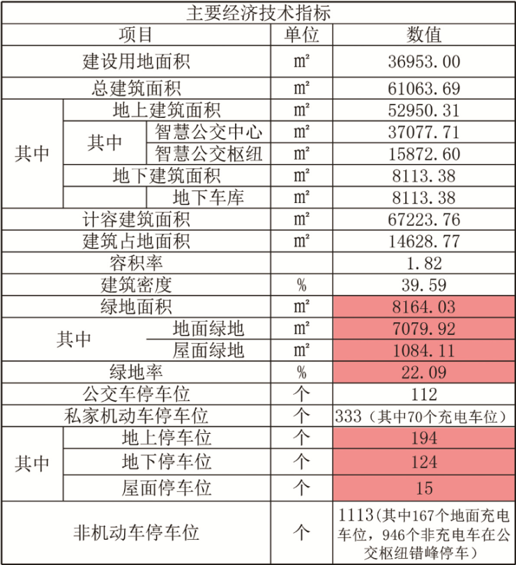 项目规划建设用地面积36953㎡(约55亩);总建筑面积:61063.69㎡;其中地上建筑面积为52950.31㎡、地下建筑面积为8113.38㎡;容积率为1.82;建筑密度39.59%;绿地率22.09%;建筑类型包括智慧公交中心、智慧公交枢纽、地下车库等;规划机动车停车位445个,非机动车位1113个(其中地面充电车位167个,非充电车在公交枢纽错峰停车946个)。