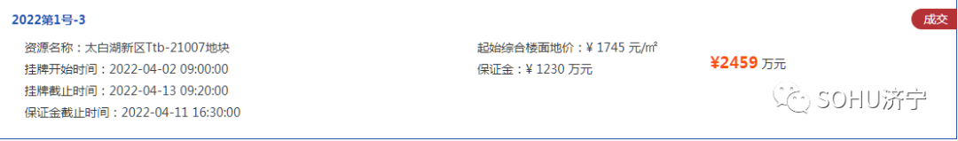 土地位于:太白湖新区车站南路以东、济宁大道以南;土地面积:7046㎡(约10.6亩);土地用途:商服用地;出让年限:40年;容积率不大于2.0;起始价:2459万元,综合楼面价起价:1745元/㎡;最终成交价为:2459万元(约232万元/亩),综合楼面地价成交价:1745元/㎡;溢价率:0.0%;