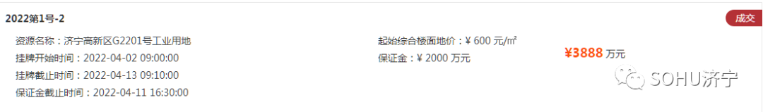 土地位于:济宁高新区海川路以东、和顺路以南;土地面积:71987㎡(约108亩);土地用途:工业用地;出让年限:50年;容积率不小于0.9;起始价:3888万元,综合楼面价起价:600元/㎡;最终成交价为:3888万元(约36万元/亩),综合楼面地价成交价:600元/㎡;溢价率:0.0%;