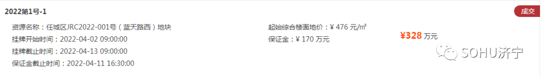 土地位于:任城区济北产业园内,蓝天路以西、济宁北站站前路以北;土地面积:11491㎡(约17.2亩);土地用途:工业用地;出让年限:50年;容积率不小于0.6;起始价:328万元,综合楼面价起价:476元/㎡;最终成交价为:328万元(约19万元/亩),综合楼面地价成交价:476元/㎡;溢价率:0.0%;