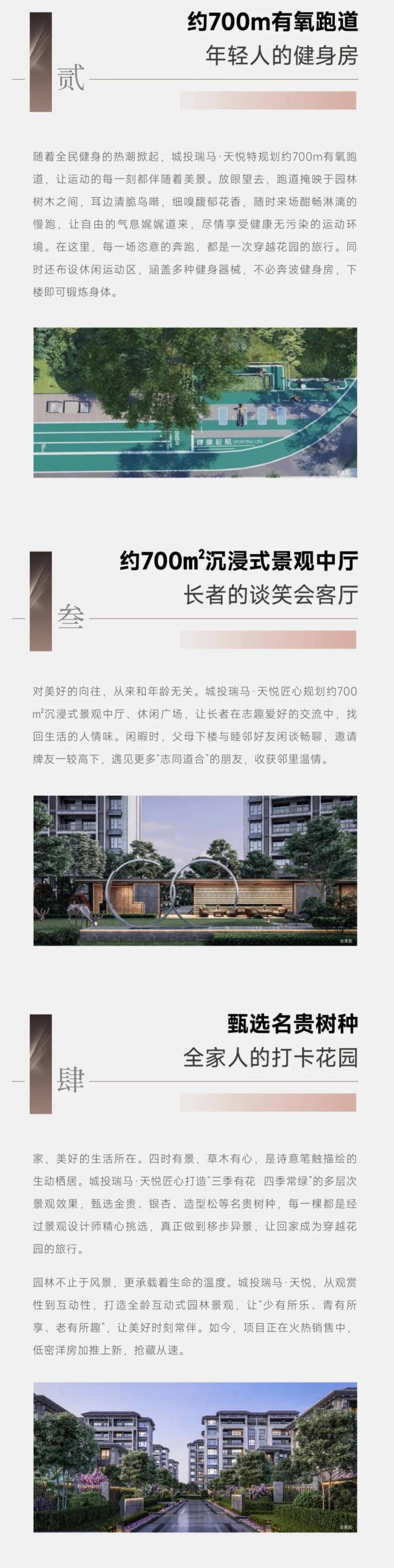 园林不止于风景,更承载着生命的温度。城投瑞马·天悦,从观赏性到互动性,打造全龄互动式园林景观,让“少有所乐、青有所享、老有所趣”,让美好时刻常伴。如今,项目正在火热销售中,低密洋房加推上新,抢藏从速。