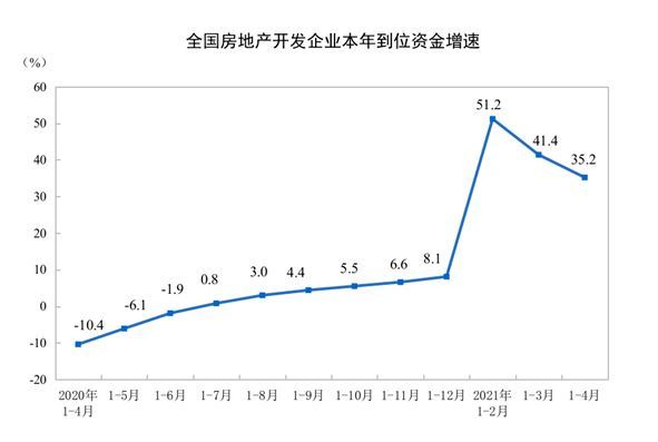 另外,按照国家统计局数据,1-4月份,房地产开发企业到位资金63542亿元,同比增长35.2%;比2019年1-4月份增长21.1%,两年平均增长10.1%。