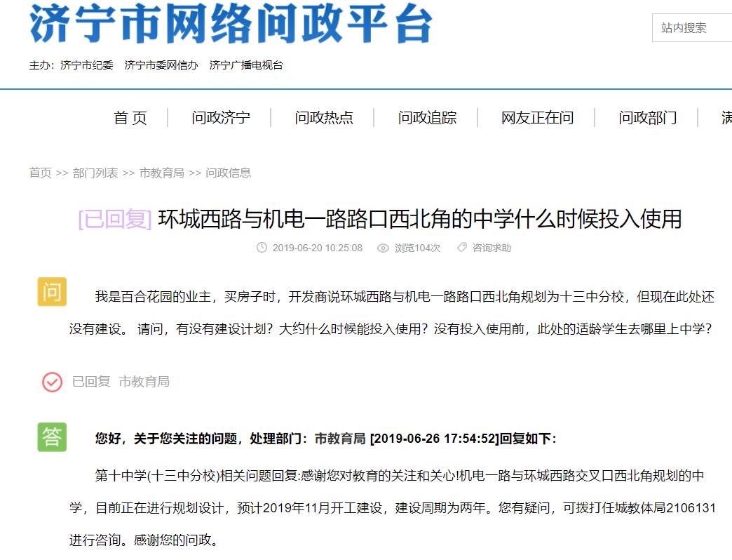 针对网友反映问题,济宁市教育局回复:机电一路与环城西路交叉口西北角规划的第十中学(十三中分校),目前正在进行规划设计,预计2019年11月开工建设,建设周期为两年。