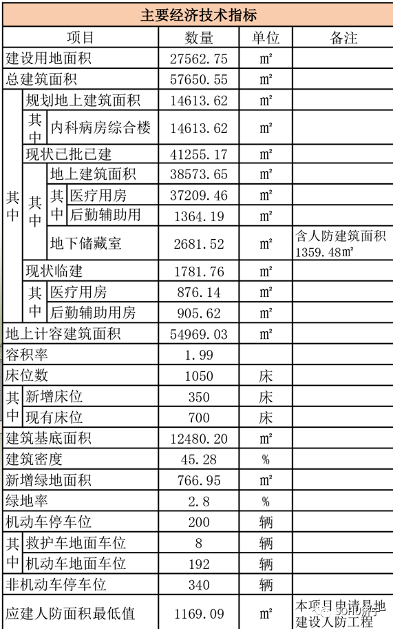 项目规划建设用地:27562.75㎡(约41亩);总建筑面积:57650.55㎡;其中地上建筑面积14613.62㎡、现状已批建41255.17㎡、临建1781.76㎡;容积率为1.99;建筑系数45.28%;绿地率2.8%;建筑为6层内科病房综合楼一栋(新增床位数约350床);规划机动车停车位200个,非机动车位340个。