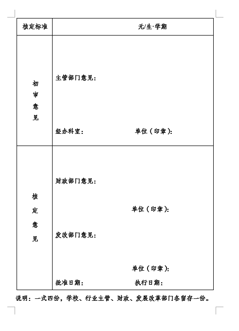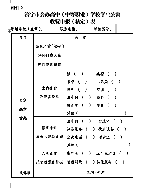 市属学校调整公寓收费标准的,填写《济宁市公办高中(中等职业)学校学生公寓收费申报表》(见附件2),报送行业主管部门初审后,报同级发展改革、财政部门批准。未经批准,学校不得擅自收费。县属公办学校学生公寓收费标准可参考市级标准自行制定。