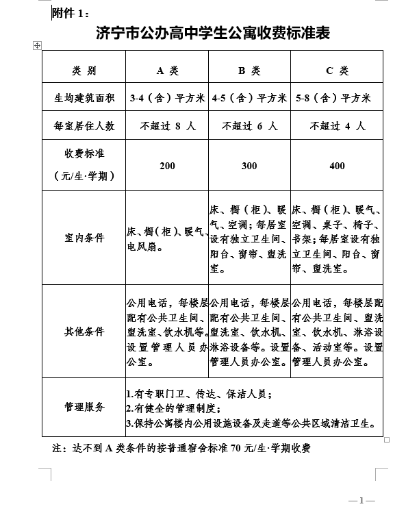 附件:1、济宁市公办高中学生公寓收费标准表