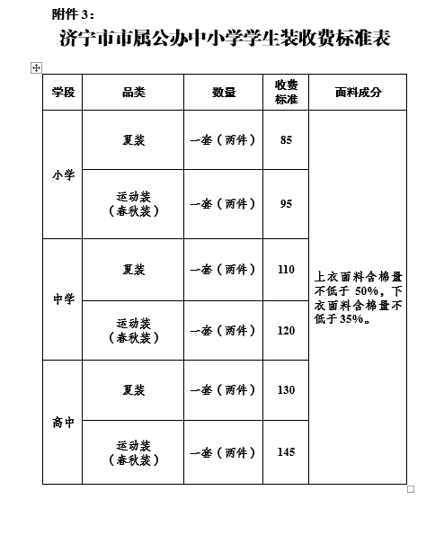 3、济宁市市属公办中小学学生装收费标准表