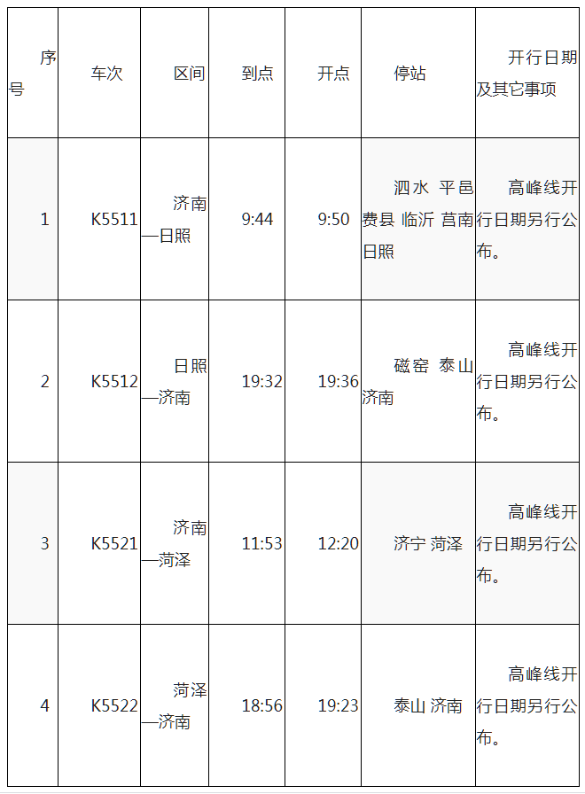 (1)增加济南—日照K5511/K5512次高峰线1对。