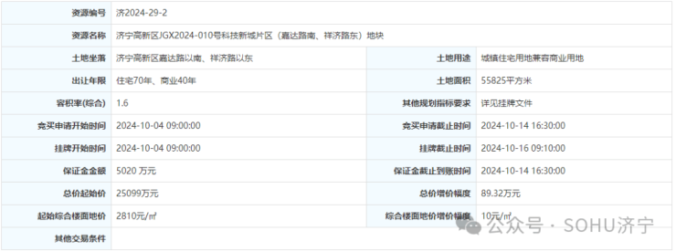 土地位于:济宁高新区嘉达路以南、祥济路以东;土地面积:55825㎡(约83.7亩);土地用途:城镇住宅用地兼容商业用地;出让年限:住宅70年,商服40年;容积率不大于1.6;起始价:25099万元,综合楼面价起价:2810元/㎡;