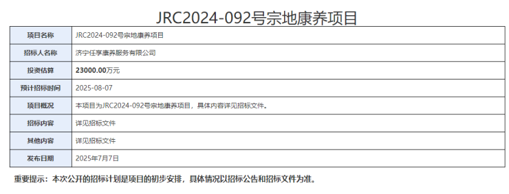 2025年7月7日,JRC2024-092号宗地康养项目招标计划发布。