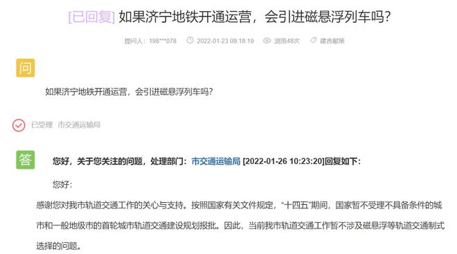 近日,搜狐网·搜狐焦点济宁小编注意到在济宁市网络问政平台上有网友提问关于济宁地铁的问题:如果济宁地铁开通运营,会引进磁悬浮列车吗?