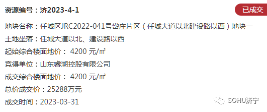 土地位于:任城大道以北、建设路以西;土地面积:33449㎡(约50亩);土地用途:商住用地;出让年限:商服40年,住宅70年;容积率不大于1.8;起始价:25288万元,综合楼面价起价:4200元/㎡;最终成交价为:25288万元(约506万元/亩),综合楼面地价成交价:4200元/㎡;溢价率:0.0%;