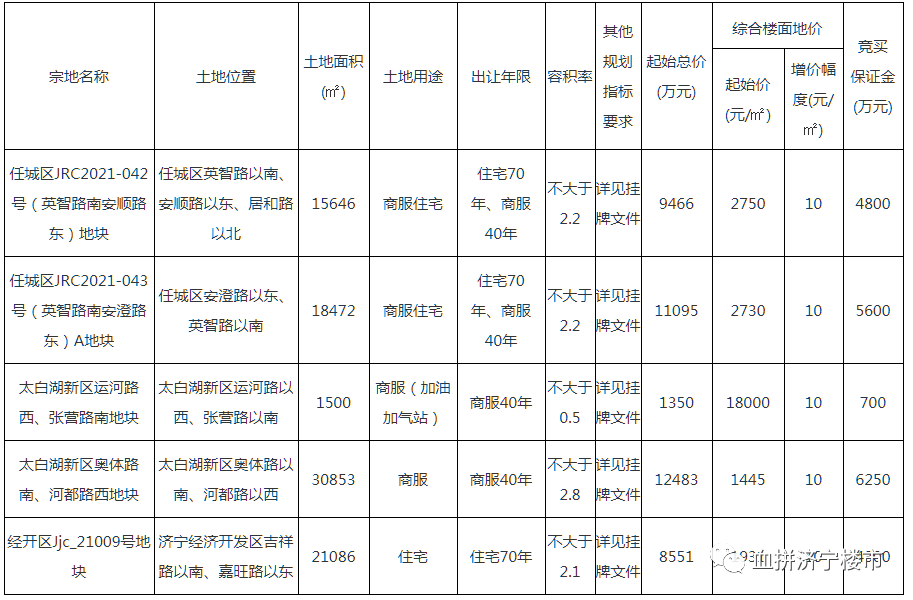 土地位于:任城区安澄路以东、英智路以南;土地面积:18472㎡(约27.7亩);土地用途:商住用地;出让年限:商业40年、住宅70年;容积率不大于2.2;起始价:11095万元,综合楼面价起价:2730元/㎡;