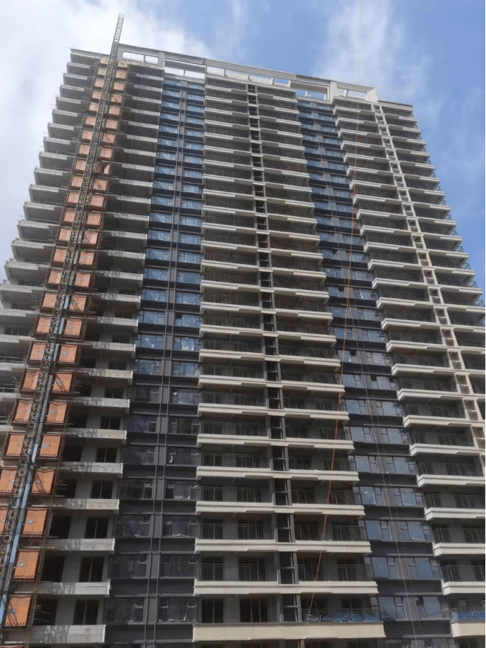 5#楼屋面、内墙抹灰、室内顶棚腻子、外墙抹灰完成;外窗施工完成85%;外墙保温完成95%,外墙真石漆完成90%。阳台栏杆安装完成。