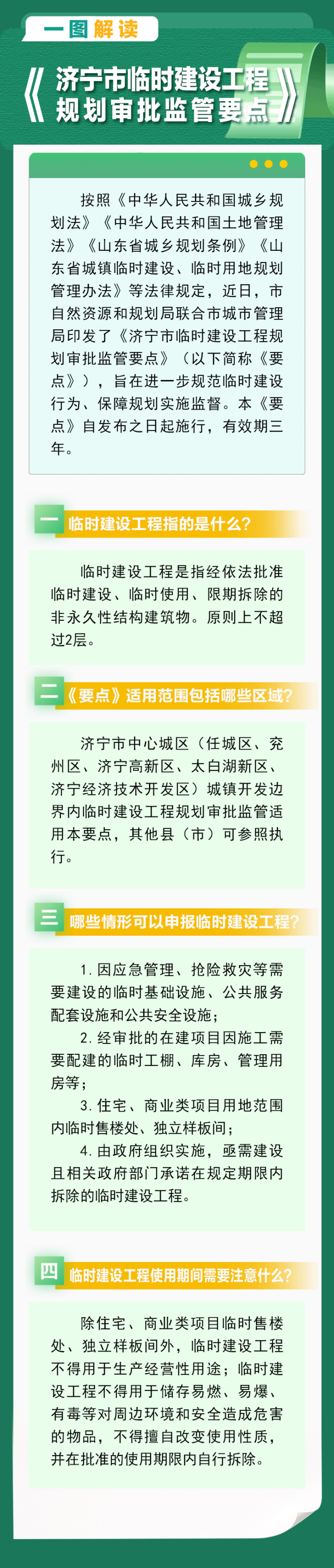 搜狐网济宁小编了解到:近日,市自然资源和规划局联合市城市管理局印发了《济宁市临时建设工程规划审批监管要点》(以下简称《要点》)。现将有关内容解读如下: