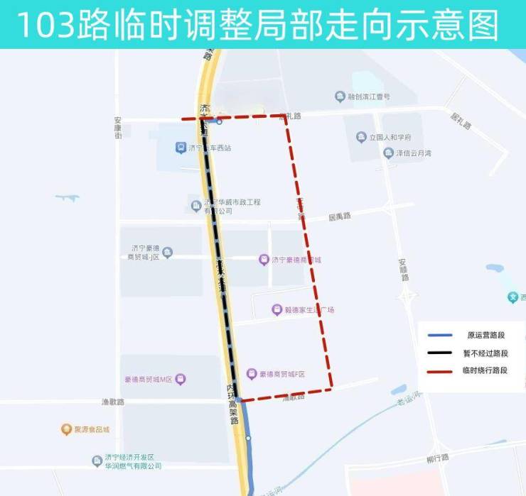 103路临时绕行路段沿济水大道向北至渔歌路,渔歌路向东至安宁路,安宁路向北至居礼路,居礼路向西至终点站恢复线路运营。临时调整后暂不经过豪德C区、豪德商贸城站点,临时停靠豪德F区南门、豪德C区东门、安宁路居礼路、西岸华府站点。