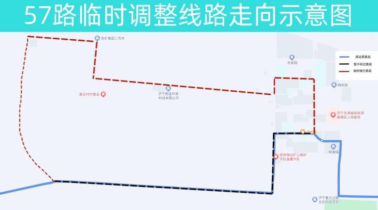 57路临时绕行路段沿珠江路、赣江路向西至嵩山路,嵩山路向北至渭河路,渭河路向西至矿外路,矿外路向南至矿井路,矿井路向西经二号井至宁安大道,宁安大道向南至小荷花路向西恢复线路运营。临时调整后暂不经过新荷农贸市场、后李庙、小荷花路矿外路站点,临时停靠济宁二号煤矿、蔡庄村、矿井路口、乡月园、梅笑园、朗风园、济东新村临时站站点。