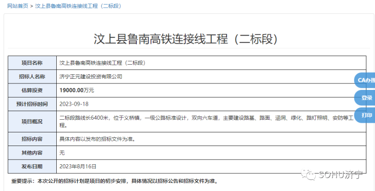 对此,汶上县政府回复如下:鲁南高铁连接线工程起于汶上任城界,止于S246,全长13.4公里,按照一级公路标准设计,双向六车道,路基宽度37.5米,初步设计概算投资4亿元。项目列入省发改委2021年省重点基础设施项目名单和2023年第二批地方政府专项债券项目清单。目前正在进行土地组卷上报等工作,已发布施工、监理招标计划,待项目用地手续批复后开工建设。力争12月底具备开工条件。