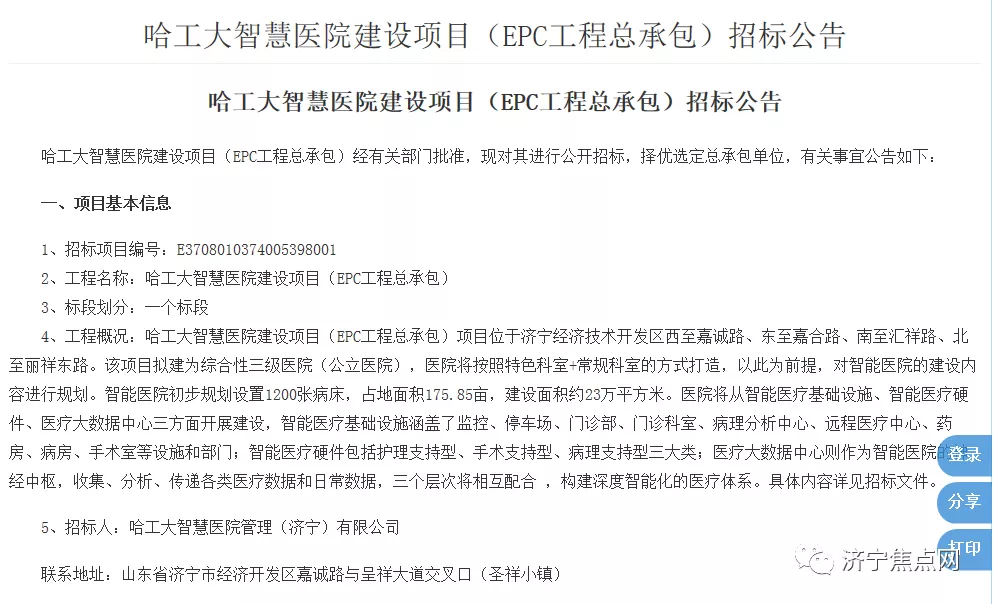 近日。济宁搜狐焦点房产网小编在相关部门了解到:落户济宁经开区的哈工大智慧医院发布了建设项目(EPC工程总承包)招标公告。