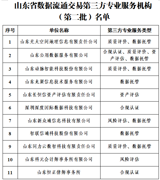 近日,山东省大数据局公布山东省数据流通交易第三方专业服务机构(第二批)名单,我市山东公用数据服务有限公司、山东动脉智能科技股份有限公司等11家单位成功入选,入选数量位居全省第三。此次济宁市11家单位成功入选,既是对各机构专业能力的充分肯定,也是济宁市持续优化数据服务生态、推动数据要素价值释放的生动实践。