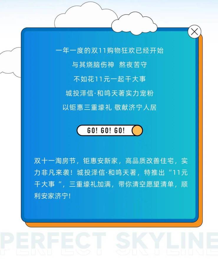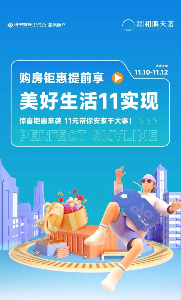 双十一淘房节,钜惠安新家,高品质改善住宅,实力非凡来袭!城投泽信·和鸣天著,特推出“11元干大事“,三重壕礼加满,带你清空愿望清单,顺利安家济宁!