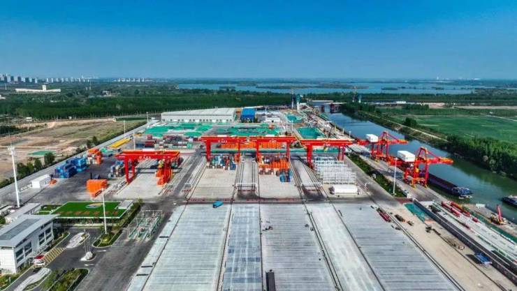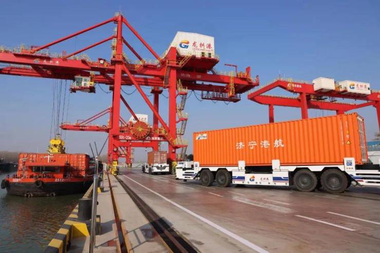 在抢抓项目建设进展的同时,龙拱港正积极推进智慧化港口建设,边建设边运营,成为全国内河首家全流程自动化的集装箱港口。“我们投用了自动化岸桥、全自动化场、无人集卡,部署工业5G专网,人工智能、数字孪生等前沿科技赋能,集装箱作业高效、智能。”龙拱港科技信息中心负责人张艳东介绍,在最近公布的加建设交通强国山东示范区试点组织单位及试点任务名单中,龙拱港“内河智慧港口”建设成为第一批试点,也是济宁市唯一的一家港口企业。