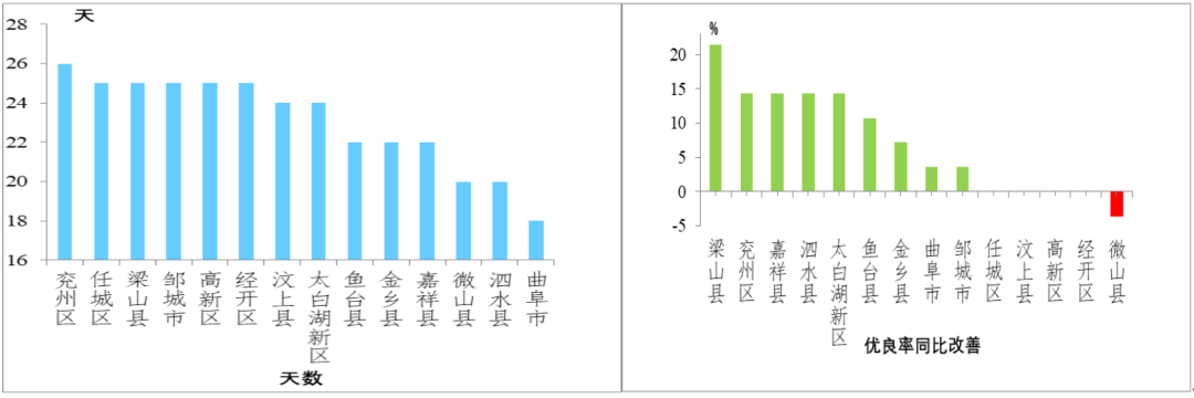 优良天最多的县(市、区)是兖州区,为26天;最少的是曲阜市,为18天;14县(市、区)优良率同比改善幅度较大的是梁山县,为提高21.4个百分点,最小的是微山县,为减少3.6个百分点。
