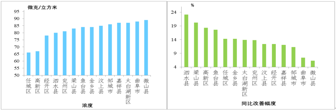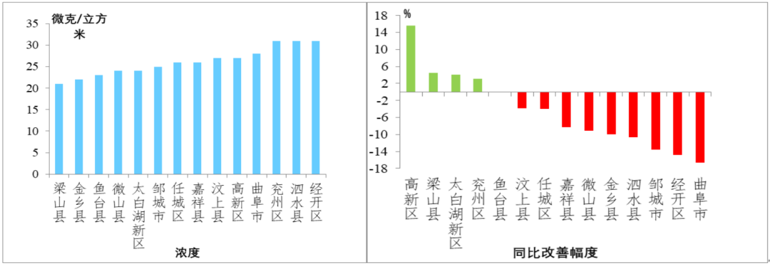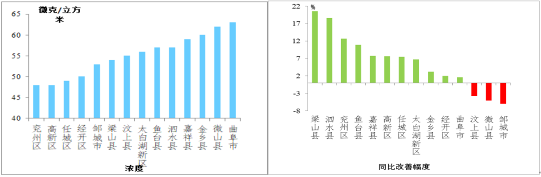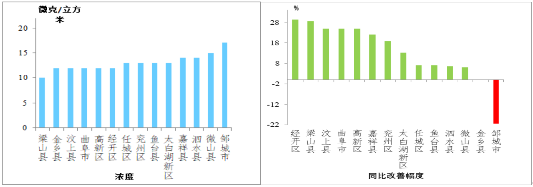 细颗粒物(PM2.5)浓度较低的县(市、区)是高新区和兖州区,均为48微克/立方米;较高的是曲阜市,为63微克/立方米;14县(市、区)同比改善幅度较大的是梁山县,改善幅度为20.6%,最小的是邹城市,为恶化6.0%。
