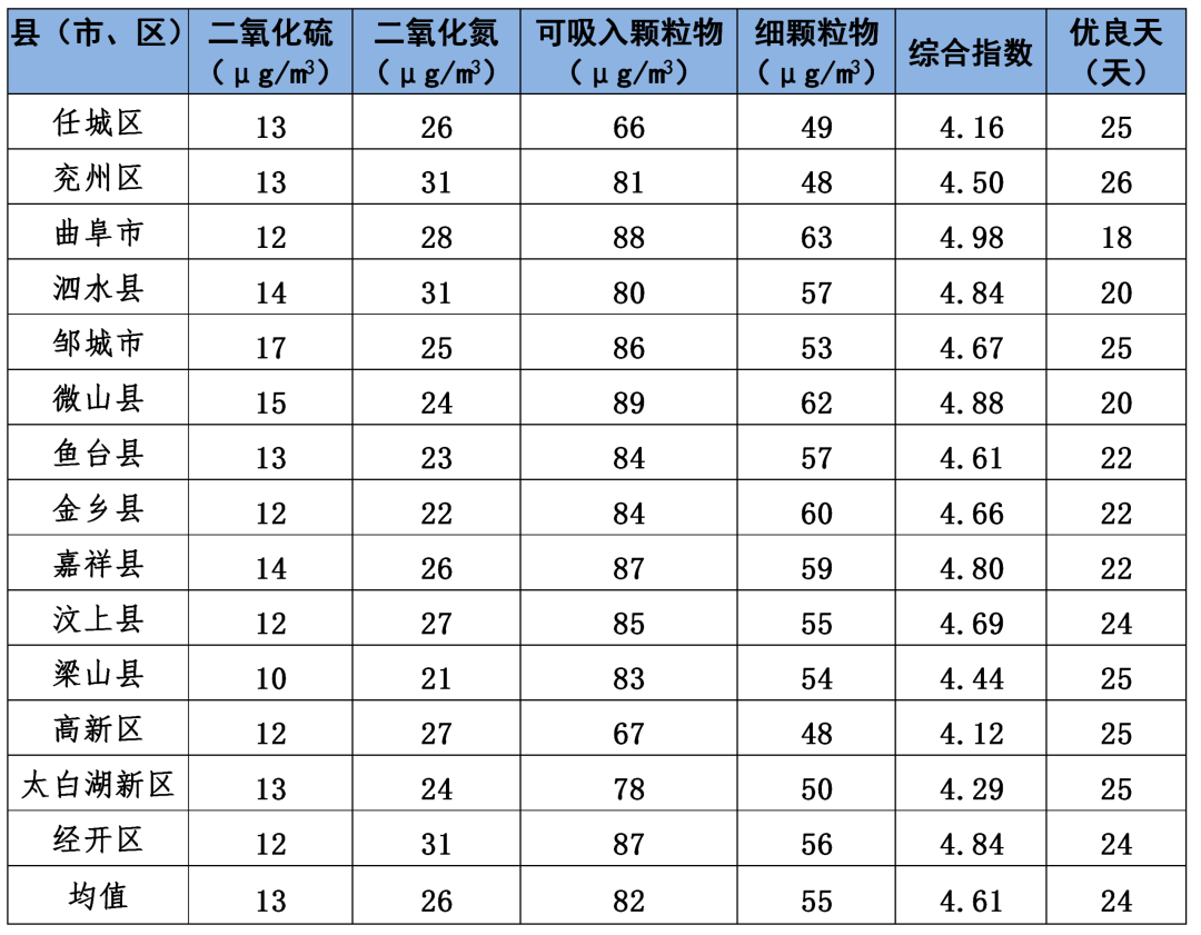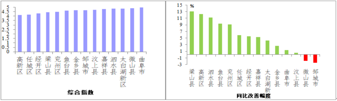 环境空气质量综合指数较好的县(市、区)是高新区,为4.12;最差的是曲阜市,为4.98;14县(市、区)同比改善幅度较大的是梁山县,改善幅度为13.1%,最小的是邹城市,为恶化2.4%。
