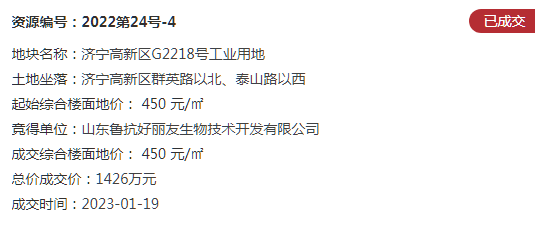 地块四:济宁高新区G2218号工业用地【山东鲁抗好丽友生物技术开发有限公司竞得】