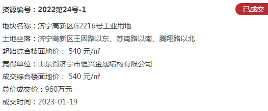 地块一:济宁高新区G2216号工业用地【山东省济宁市恒兴金属结构有限公司竞得】
