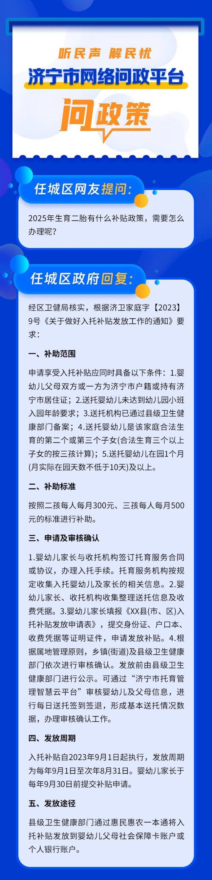 问政策:2025年济宁市生育二胎有何补贴?如何办理?