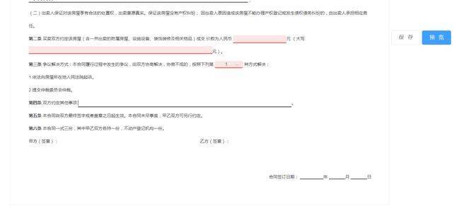 7. 合同签约:核对买卖双方名字、身份证号、联系方式、坐落位置等信息,在第二条红色框里填写交易价格,注意大小写;第三条选择争议解决方式。第四条填写约定事项,没有可不写。信息填写无误点击右边保存。点击下一步。