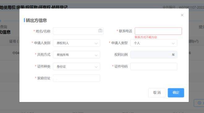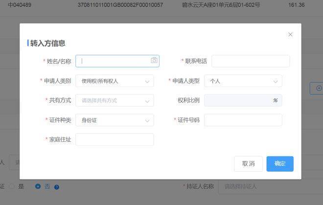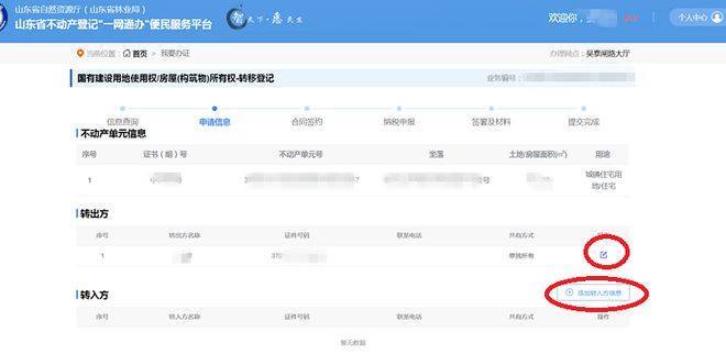 6. 申请信息:编辑转出方(卖方)、转入方(买方)信息,每个红色标注的必填;买方为一人则为单独所有,两人及以上为共同共有,若共有方式为按份共有,还需填写产权比例。