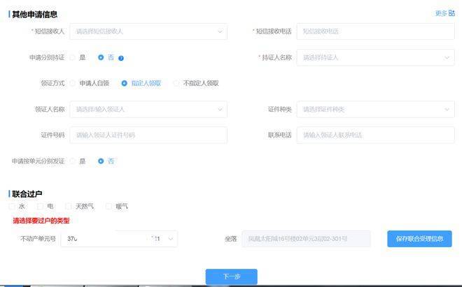 ①其他申请信息:其他选择短信接收人,产权证书领取人。