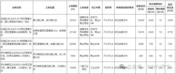 从5宗地块的具体分布上看,任城区3宗、济宁高新区2宗。从土地用途来看,2宗城镇住宅用地兼容商业用地、2宗商业用地、1宗二类工业用地。土地总面积为101591㎡,约152亩;起始价为35313万元。