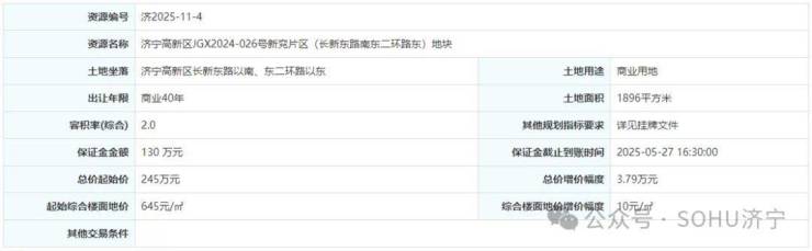 土地位于:济宁高新区长新东路以南、东二环路以东;土地面积:1896㎡(约3亩);土地用途:商业用地;出让年限:40年;容积率不大于2.0;起始价:245万元,综合楼面价起价:645元/㎡;最终成交价为:245万元(约82万元/亩),综合楼面地价成交价:645元/㎡;溢价率:0.0%;