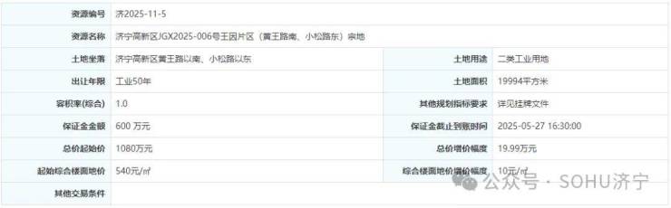土地位于:济宁高新区黄王路以南、小松路以东;土地面积:19994㎡(约30亩);土地用途:二类工业用地;出让年限:50年;容积率不小于1.0;起始价:1080万元,综合楼面价起价:540元/㎡;最终成交价为:1080万元(约36万元/亩),综合楼面地价成交价:540元/㎡;溢价率:0.0%;