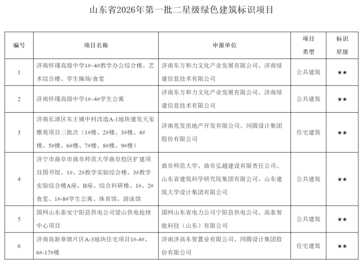 济宁一项上榜!山东省2026年第一批二星级绿色建筑标识项目公告发布