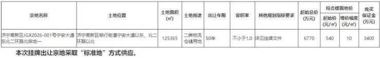 土地位于:济宁高新区柳行街道宁安大道以东、北二环路以北;土地面积:125365㎡(约188亩);土地用途:二类物流仓储用地;出让年限:50年;容积率:不大于1.0;起始价:6770万元,综合楼面价起价:540元/㎡;最终成交价为:6770万元(约36万元/亩),综合楼面地价成交价:540元/㎡;溢价率:0.0%;