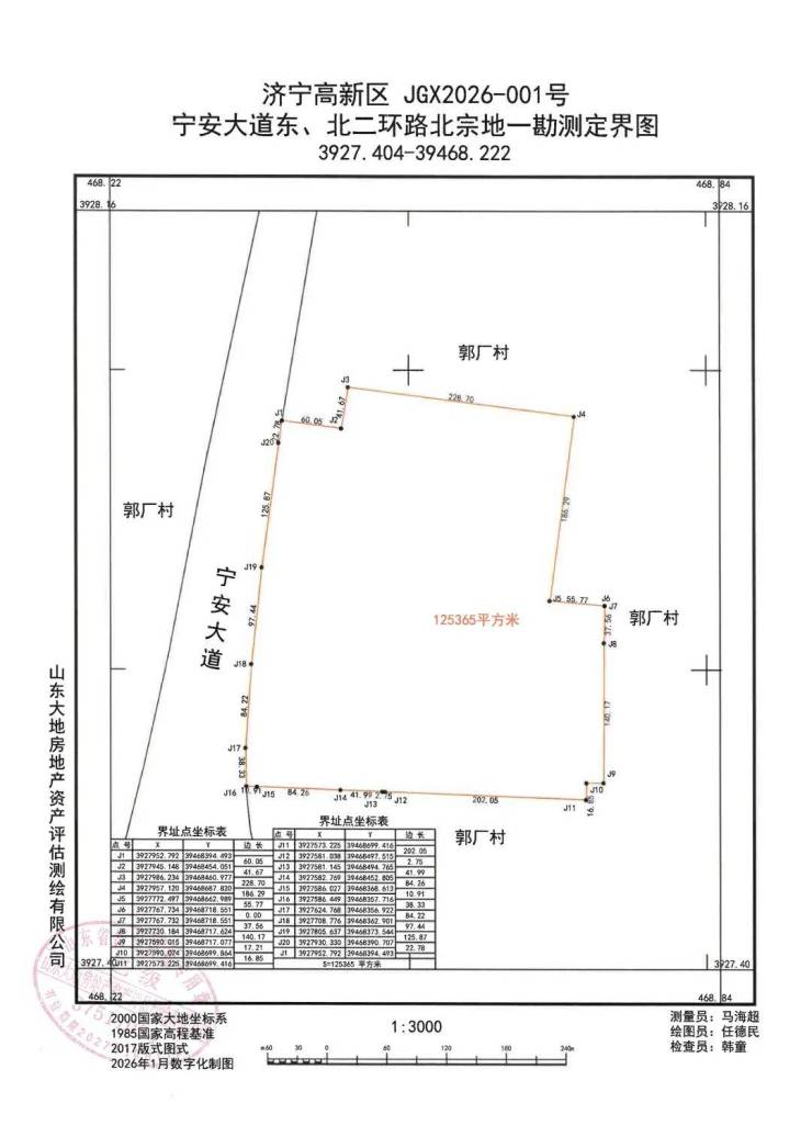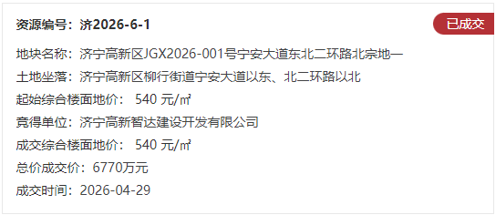 地块名:济宁高新区JGX2026-001号宁安大道东北二环路北宗地一【济宁高新智达建设开发有限公司竞得】