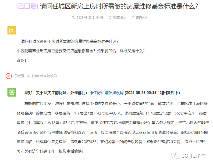 任城区住房与配套商业用房的维修基金标准是什么?官方回复来了