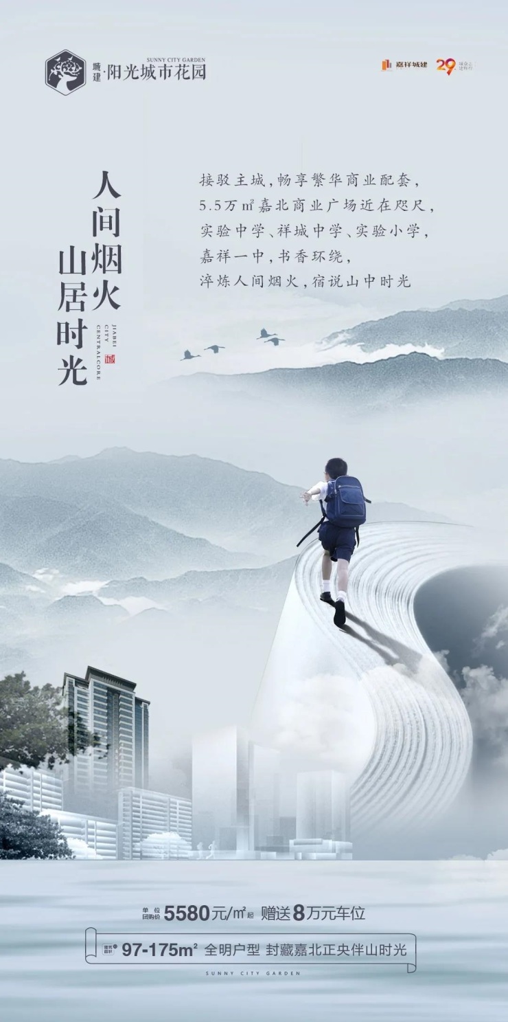 阳光城市花园接驳主城,畅享繁华商业配套,5.5万㎡嘉北商业广场近在咫尺,实验中学、祥城中学、实验小学,嘉祥一中,书香环绕,淬炼人间烟火,宿说山中时光。