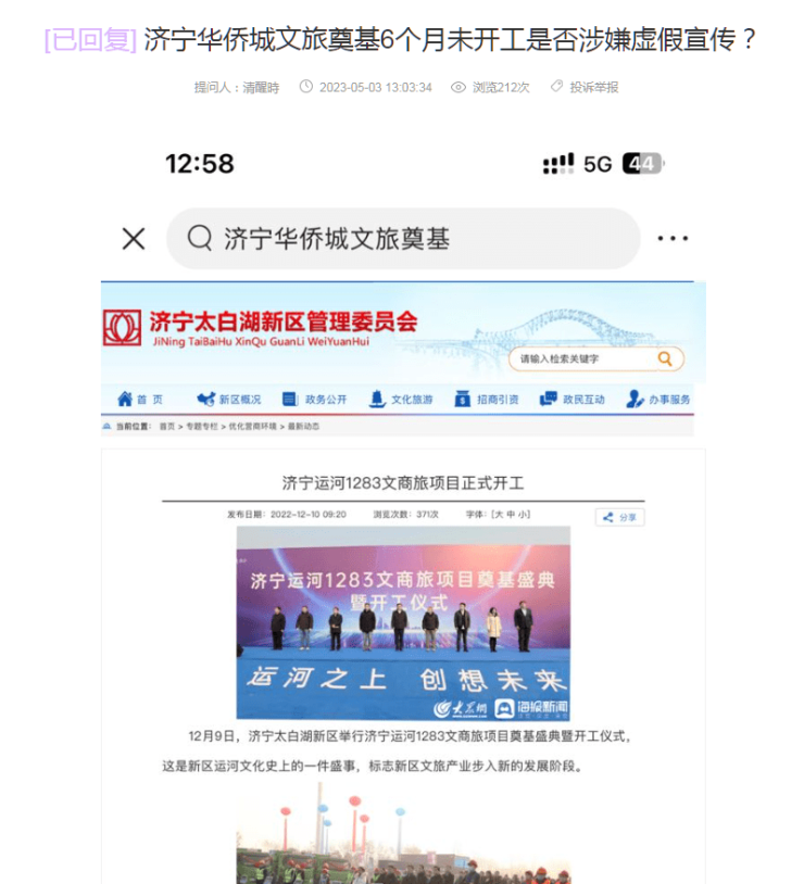 近日,搜狐网济宁小编在济宁市网络问政平台上注意到有网友问政:济宁华侨城文旅在2022年12月就做了奠基活动,目前去现场查看至今未动工,连奠基石还在那里呢?其举办的奠基盛典暨开工仪式,是否涉嫌欺骗购房者,虚假宣传,请有关部门尽快督促解决!