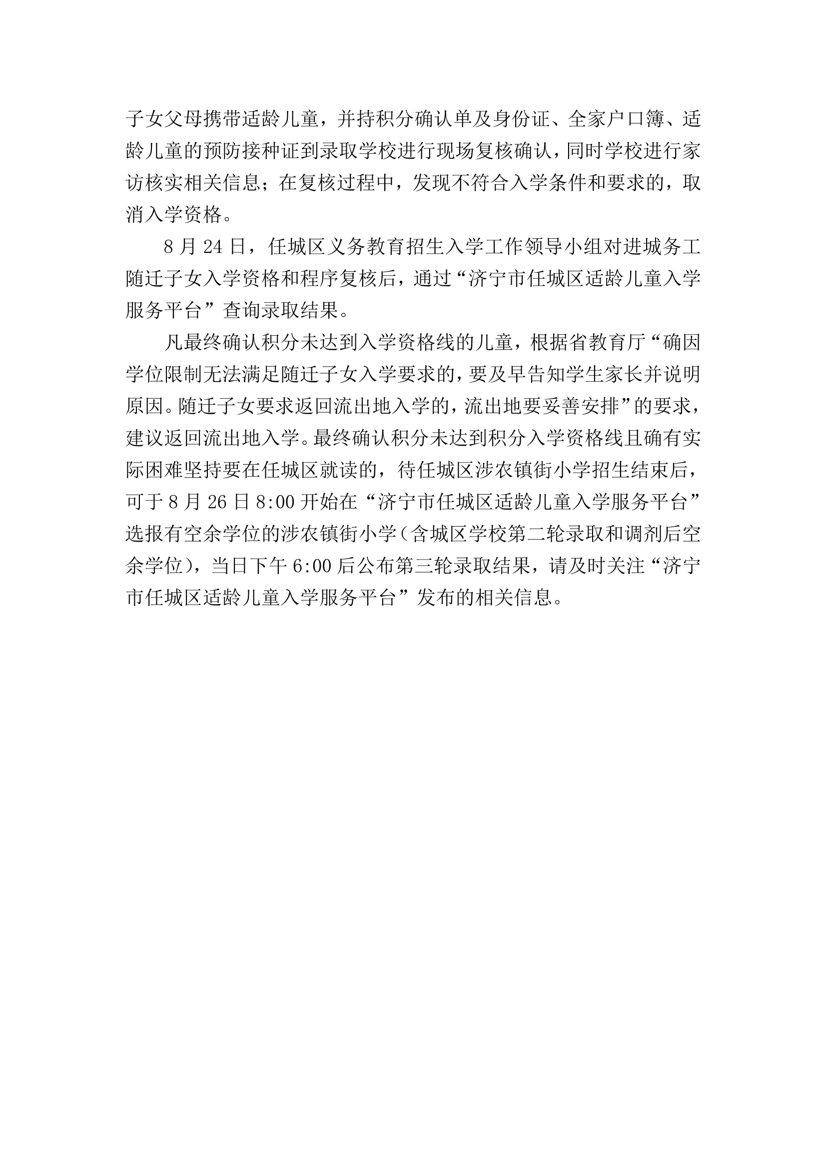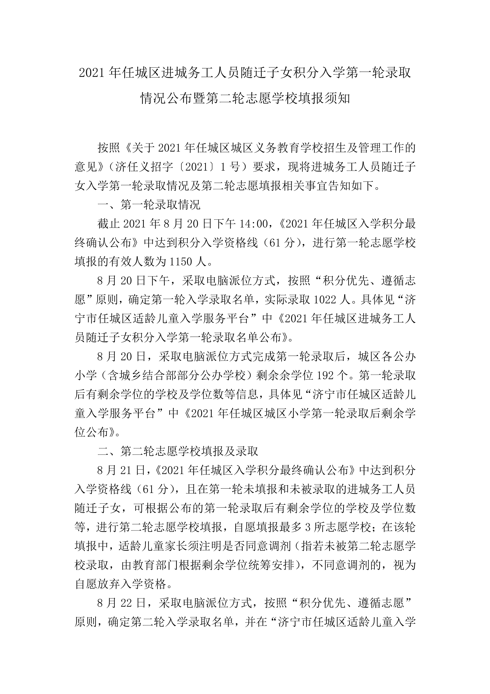 2021年任城区进城务工人员随迁子女积分入学排名前列轮录取情况公布暨第二轮志愿学校填报须知
