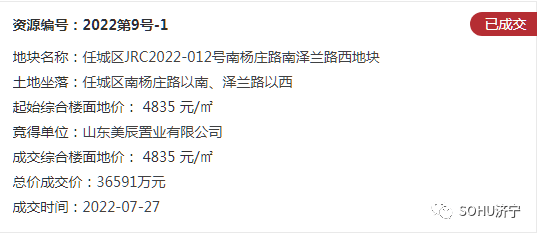土地位于:任城区南杨庄路以南、泽兰路以西;土地面积:37839㎡(约56.7亩);土地用途:商住用地;出让年限:住宅70年,商业40年;容积率不大于2.0;起始价:36591万元,综合楼面价起价:4835元/㎡;最终成交价为:36591万元(约645万元/亩),综合楼面地价成交价:4835元/㎡;溢价率:0.0%;
