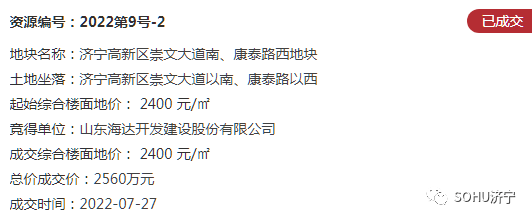地块二:济宁高新区崇文大道南、康泰路西地块【山东海达开发建设股份有限公司竞得】